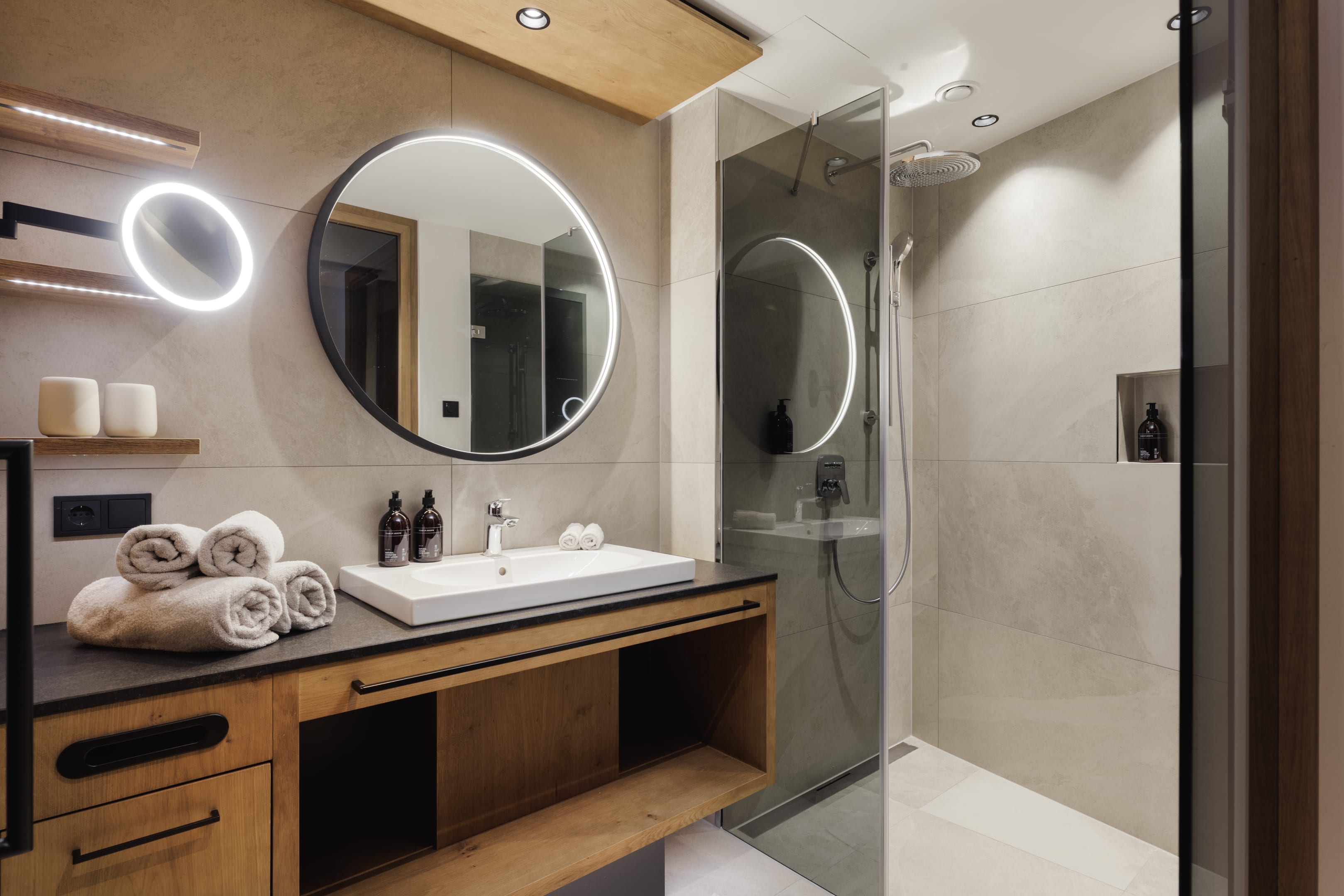 Genieße höchsten Komfort im separaten Badezimmer und WC mit einer luxuriösen Regendusche und hochwertigen Pflegeprodukten. Flauschige Handtücher und Bademäntel (Kinderbademäntel auf Anfrage an der Rezeption) stehen für dich bereit.