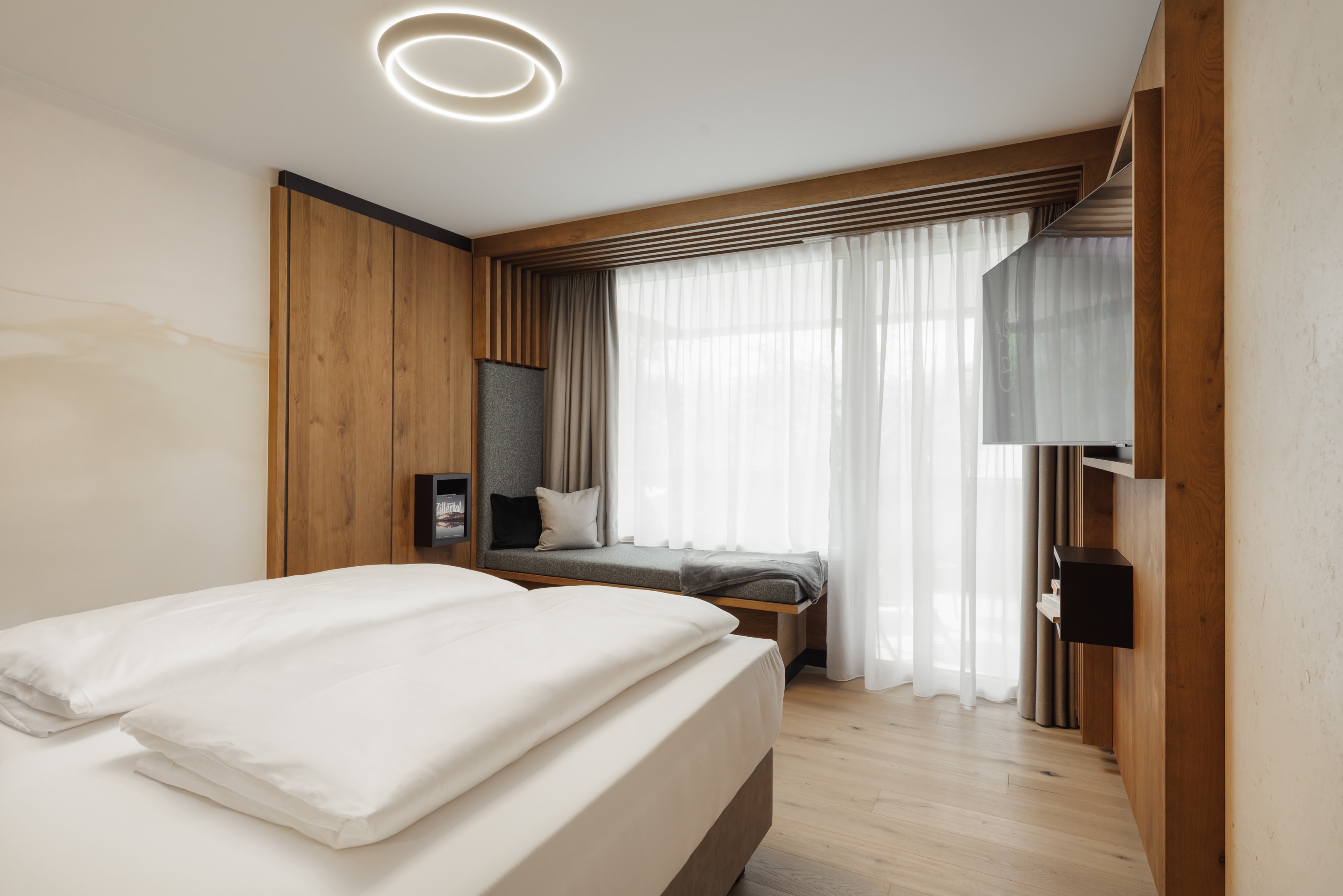 LEBHAFT relaxen. Auf 27m² bietet dieses Doppelzimmer Platz und Luxus für bis zu zwei Gäste mit einem hochwertigen Kingsize-Boxspringbett.